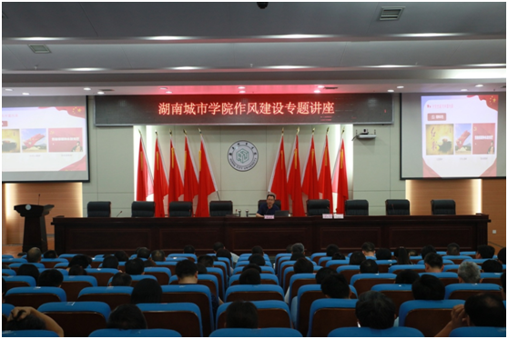 2019年7月3日下午,湖南城市学院作风建设专题讲座在逸夫图书馆报告厅举行,在家的校领导、全校副处级以上领导干部、党支部书记参加讲座。讲座由党委副书记、校长李建奇主讲,由党委委员、副校长郑卫民主持。