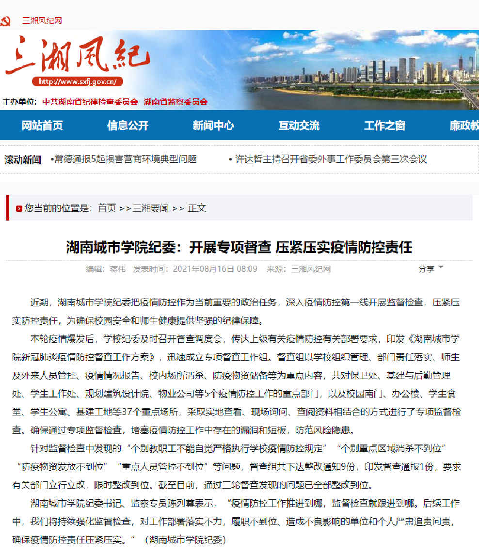 本轮疫情爆发后,学校纪委及时召开督查调度会,传达上级有关疫情防控有关部署要求,印发《湖南城市学院新冠肺炎疫情防控督查工作方案》,迅速成立专项督查工作组。督查组以学校组织管理、部门责任落实、师生及外来人员管控、疫情情况报告、校内场所消杀、防疫物资储备等为重点内容,共对保卫处、基建与后勤管理处、学生工作处、规划建筑设计院、物业公司等5个疫情防控工作的重点部门,以及校园南门、办公楼、学生食堂、学生公寓、基建工地等37个重点场所,采取实地查看、现场询问、查阅资料相结合的方式进行了专项监督检查。确保通过专项监督检查,堵塞疫情防控工作中存在的漏洞和短板,防范风险隐患。